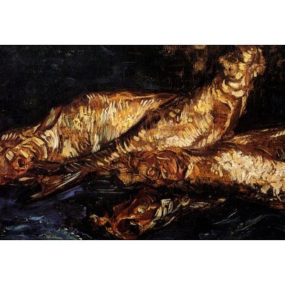 Vincent Willem van Gogh (30 March 1853 - 29 July 1890) was a Dutch Post-Impressionist artist. Some of his paintings are now among the world's best known, most popular and expensive works of art. Most of his best-known works were produced in the final two years of his life, during which time he cut off part of his left ear following a breakdown in his friendship with Paul Gauguin. After this he suffered recurrent bouts of mental illness, which led to his suicide. His popular works include The Starry Night, Starry Night Over the Rhone, The Night Cafe, Bedroom in Arles, Sunflowers, Cafe Terrace at Night..../ Professionally Framed Vincent Van Gogh Still Life with Bloaters Art Print Poster - 11x17 with RichAndFramous Black Wood Frame / Still Life Art